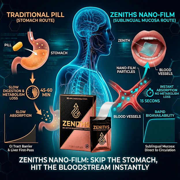 ZENITHS utilizes X-TRIDENT™ 720 nano-film technology rather than traditional tablets. It is absorbed sublingually (under the tongue), kicking in within 15 seconds with 98% bioavailability, effectively bypassing the headaches and stomach upset common with old-school pills.
